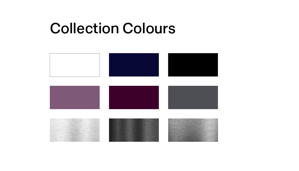 THE COLOURS Die Farbwelt bleibt präzise und selbstbewusst. Schwarz und Navy bilden die Grundlage. Ein tiefes Burgund und Graumélanges ergänzen die Basics und verleihen ihnen eine neue haptische Tiefe. Klares Weiß, leuchtendes Blau und mattiertes Lila sorgen für grafische, akzentuierte Helligkeit. Metallische Nuancen setzen Highlights und unterstreichen den Charakter von STUDIO.
