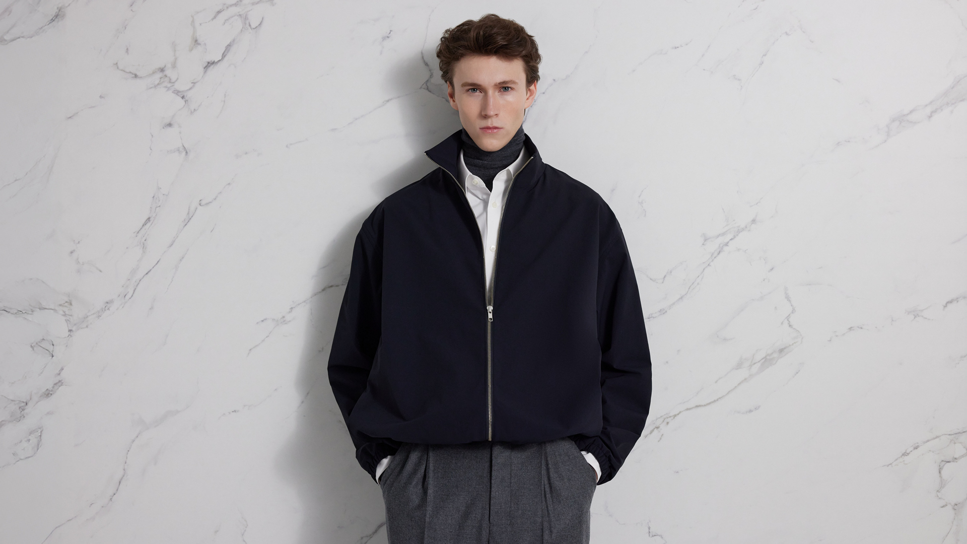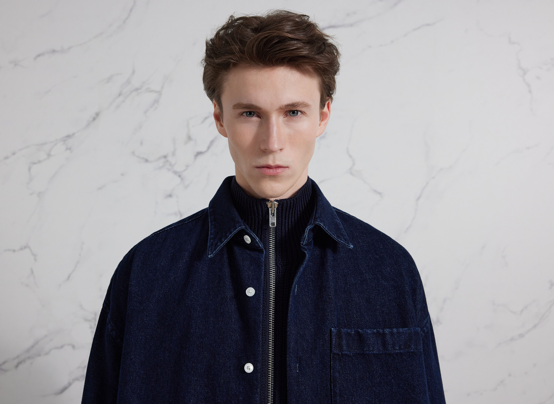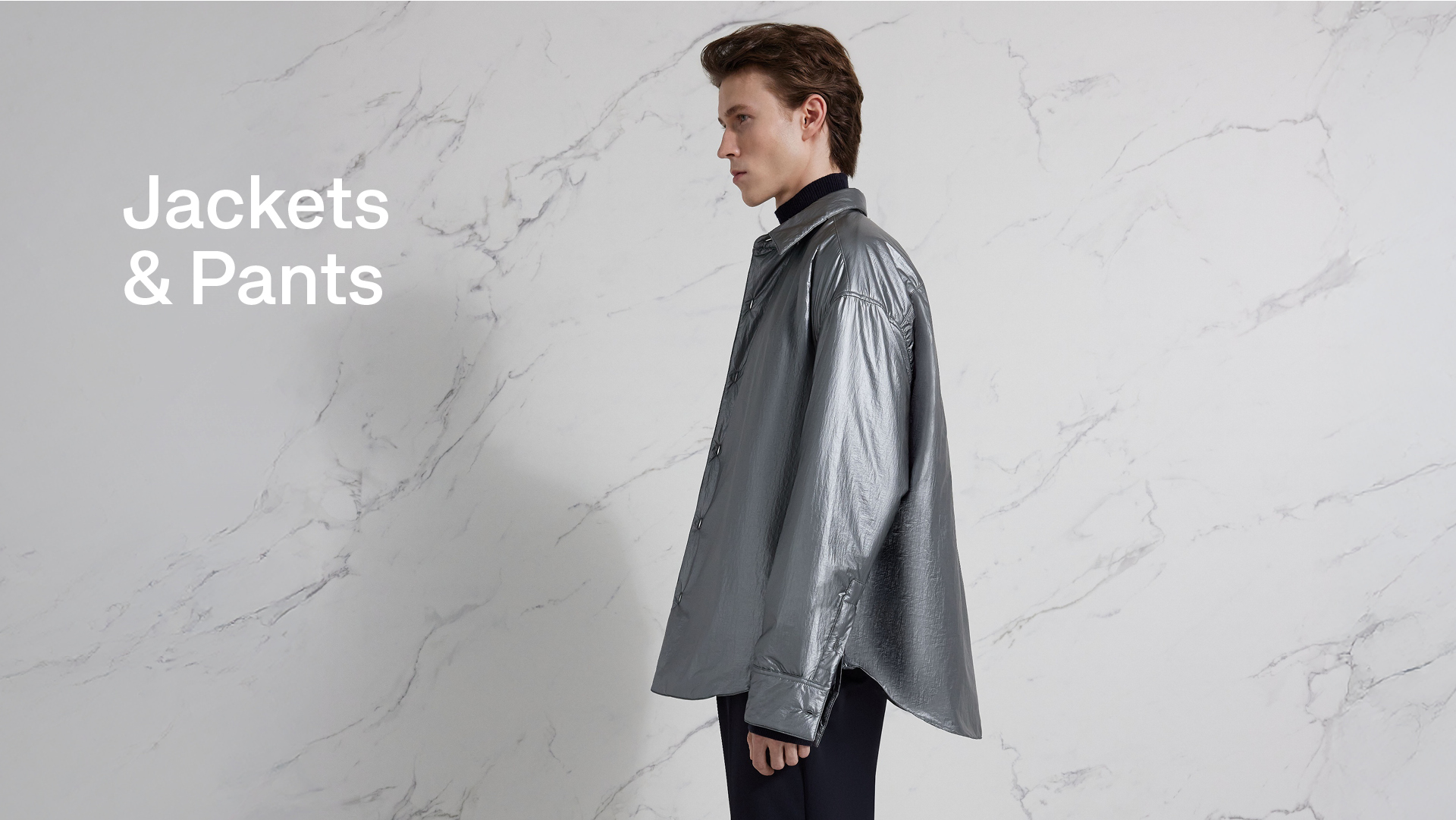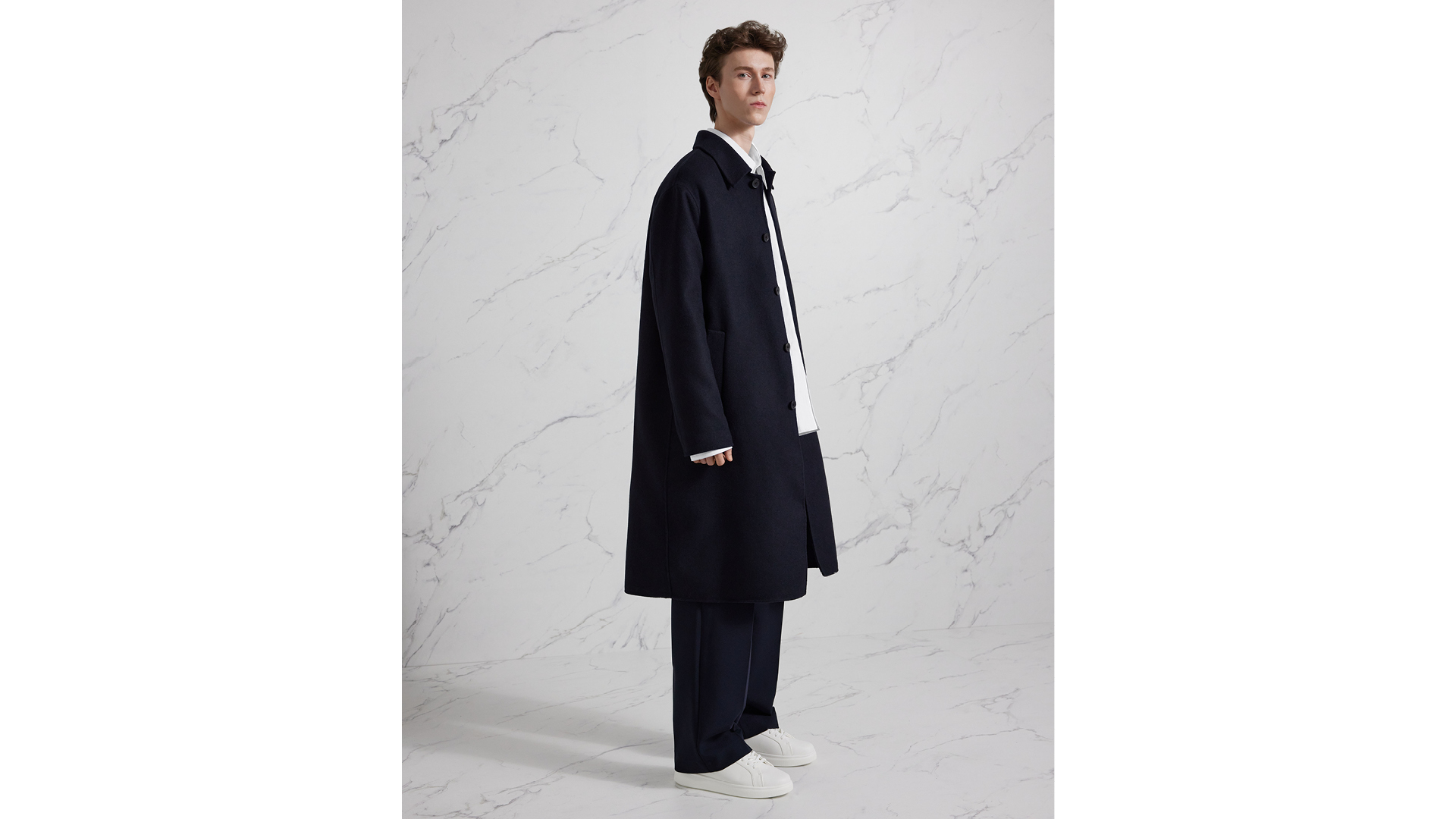Sartoriale Codes treffen auf urbane Funktionalität und lassen neue Proportionen entstehen. Traditionelle Stoffe und klassische Typologien werden durch moderne Schnitte und technische Qualitäten aufgebrochen. So entsteht eine Neuinterpretation von Vertrautem, die Spannung erzeugt. Japanische Cordura-Qualitäten sorgen für Funktionalität und Langlebigkeit, während metallisches Nylon die visuelle Tiefe der Kollektion prägt. Flanell und haptische Wollmischungen sorgen für Tiefe und Struktur in den Silhouetten. Protagonisten sind Anoraks, Bomber, Mäntel sowie Blazer, geprägt von einer dekonstruierten und überschnittenen Linienführung.