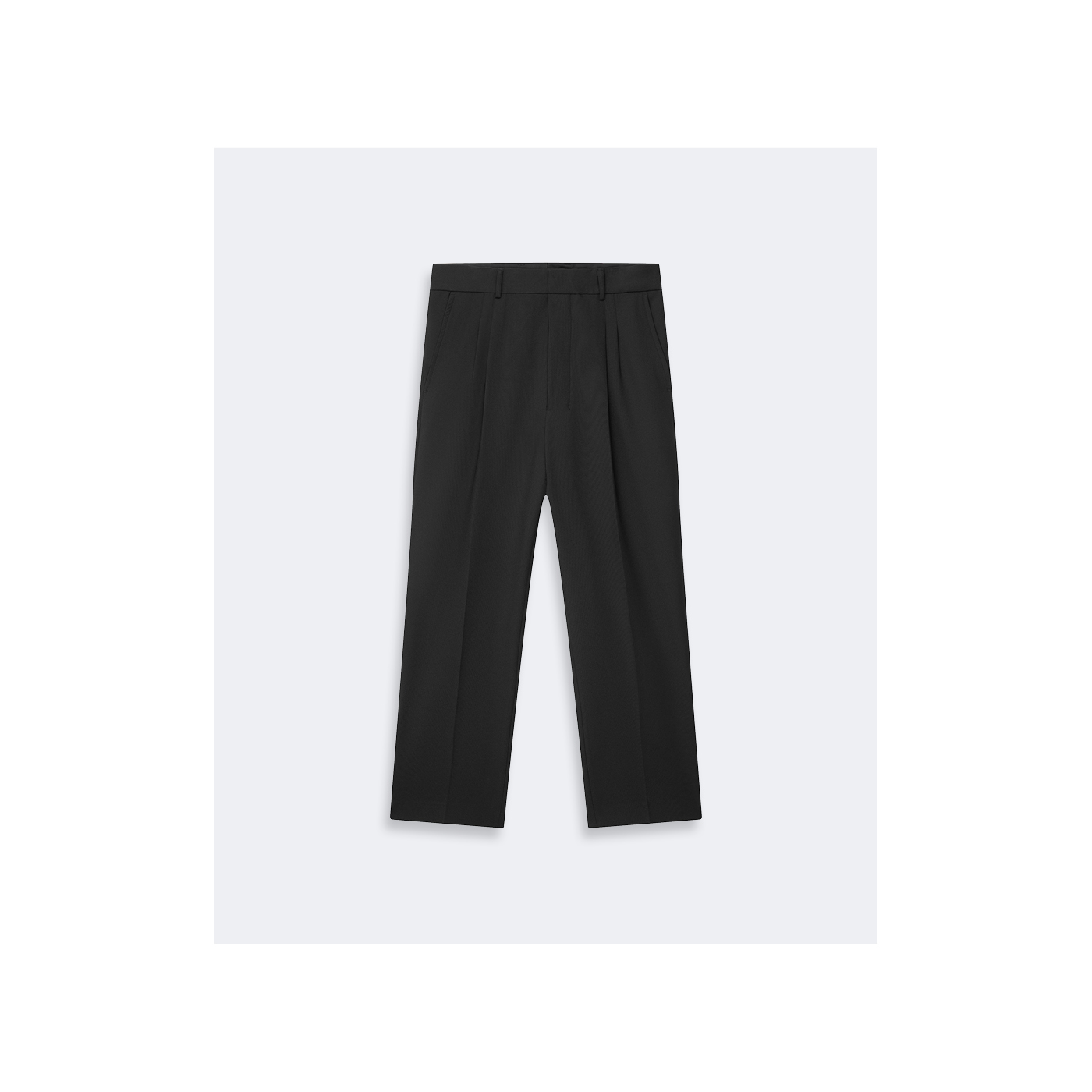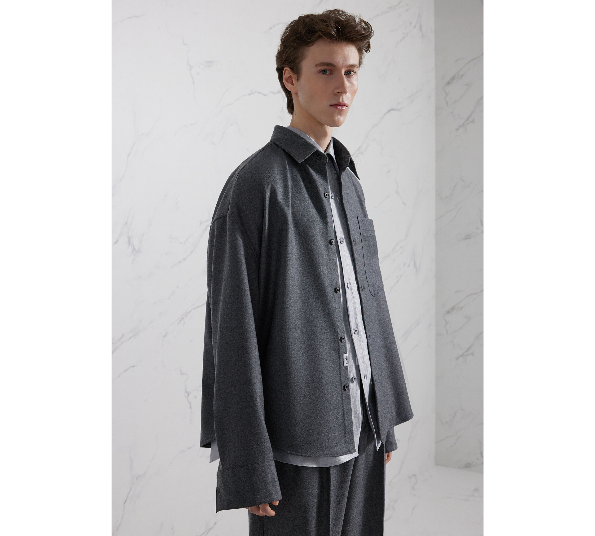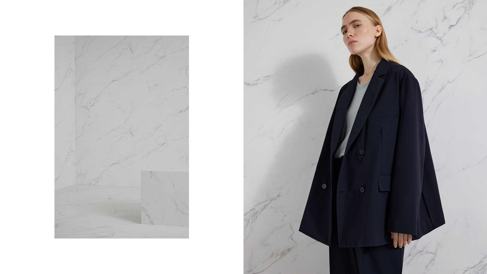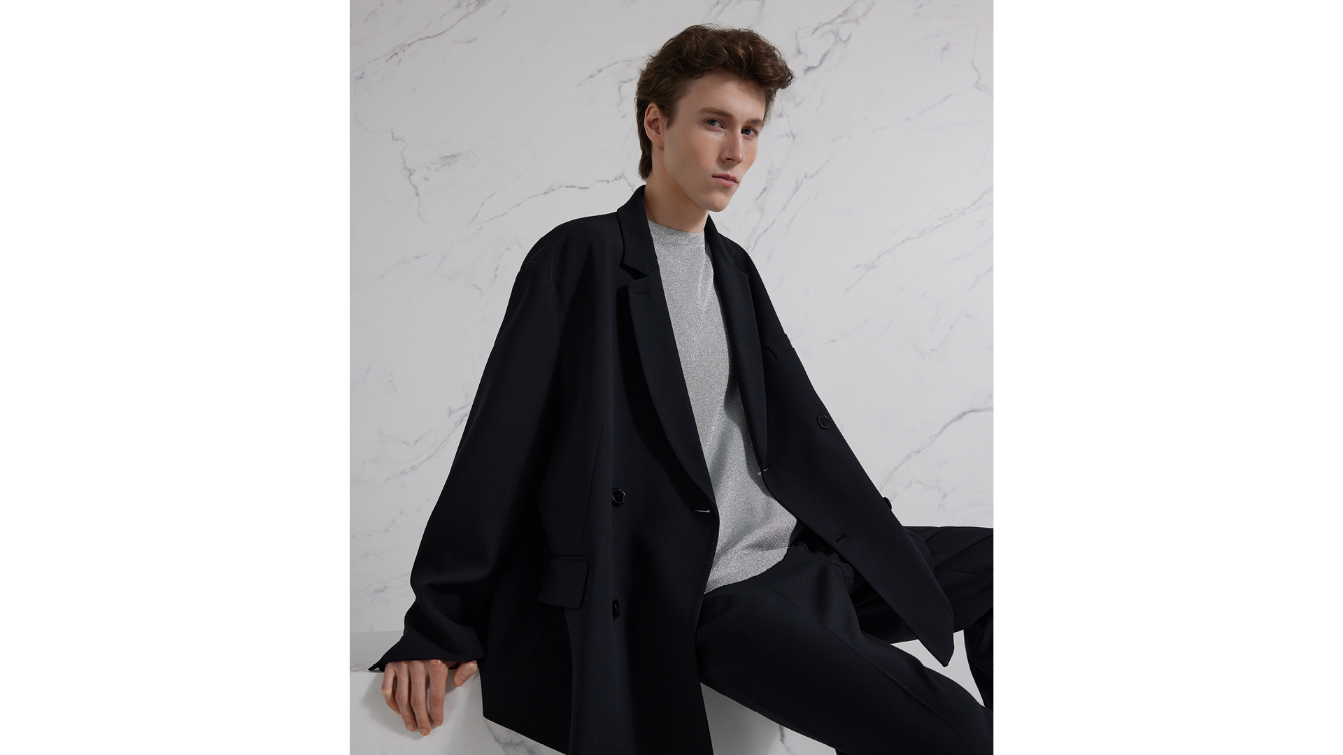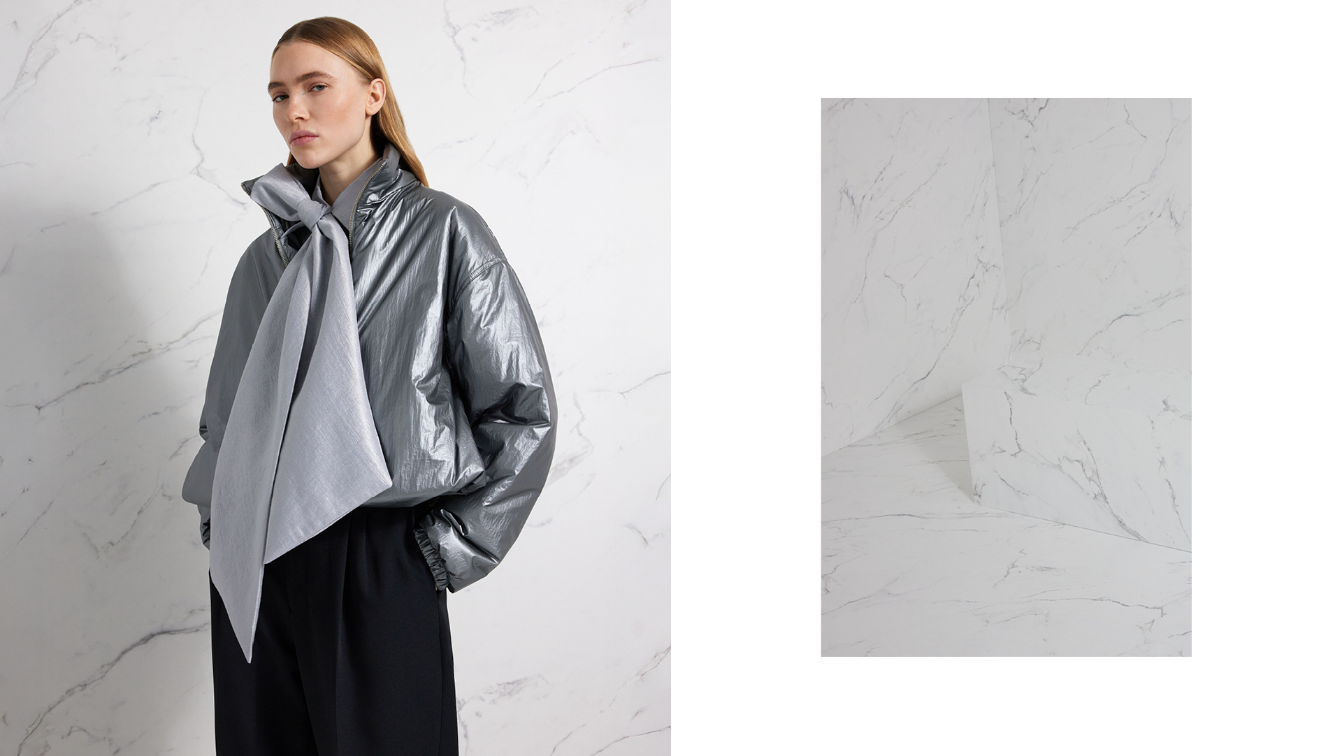 Sartoriale Codes treffen auf urbane Funktionalität und lassen neue Proportionen entstehen. Traditionelle Stoffe und klassische Typologien werden durch moderne Schnitte und technische Qualitäten aufgebrochen. So entsteht eine Neuinterpretation von Vertrautem, die Spannung erzeugt. Japanische Cordura-Qualitäten sorgen für Funktionalität und Langlebigkeit, während metallisches Nylon die visuelle Tiefe der Kollektion prägt. Flanell und haptische Wollmischungen sorgen für Tiefe und Struktur in den Silhouetten. Protagonisten sind Anoraks, Bomber, Mäntel sowie Blazer, geprägt von einer dekonstruierten und überschnittenen Linienführung.