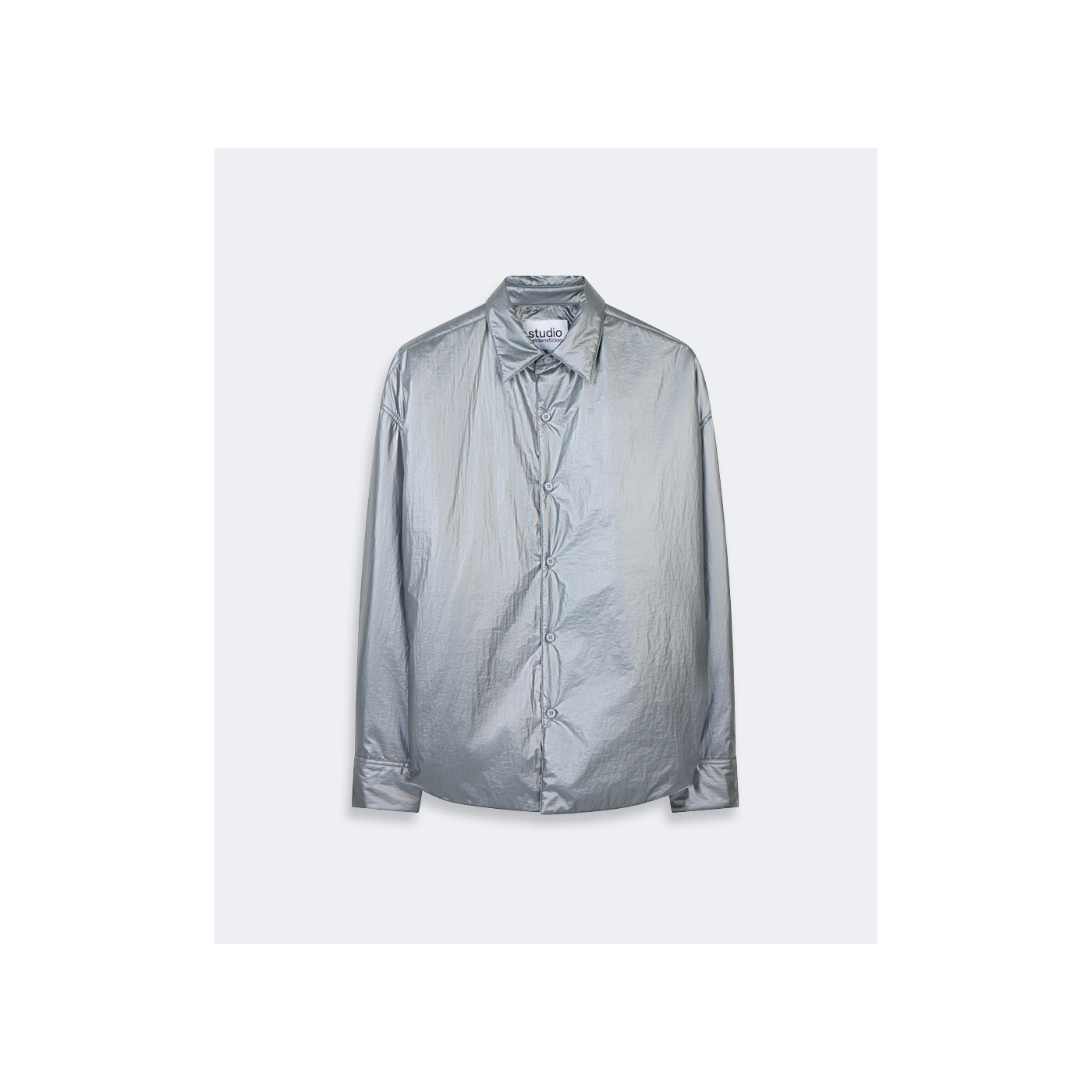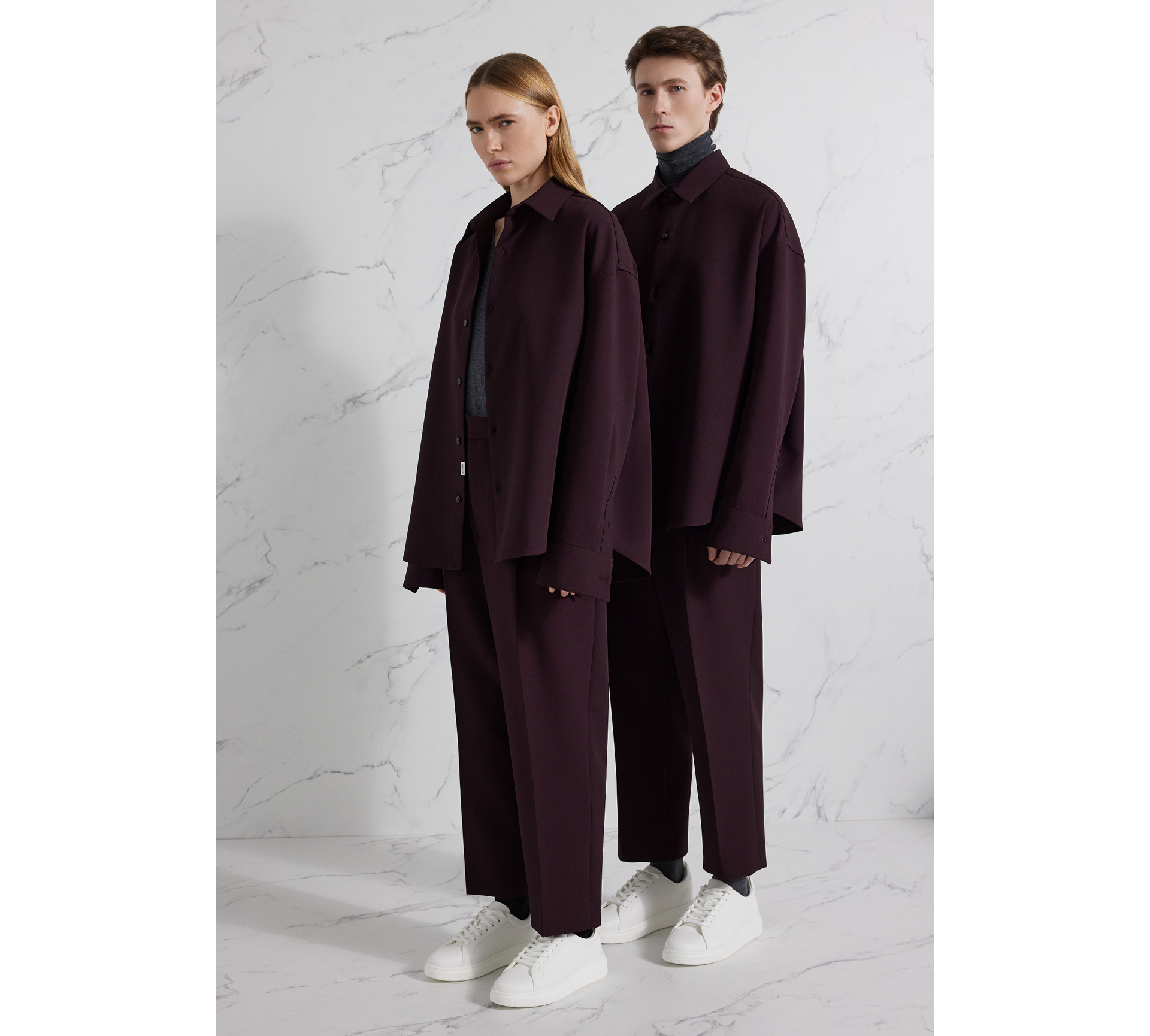 Relaxed, oversized, boxy – die Silhouetten brechen bewusst mit Konventionen. Fließende Stoffe treffen auf kompakte, technische Oberflächen, wodurch Haptik und Leichtigkeit in einen spannungsvollen Dialog treten. Grafische Streifen übersetzen klassische Codes in eine moderne, reduzierte Formsprache. Opulente Details setzen Akzente und treffen auf metallisches Nylon. Das Spektrum reicht von puristischen Unis bis hin zu subtilen Texturen. Mit ihrer klaren Formensprache und materialgetriebenen Ästhetik bilden die Shirt- und Overshirt-Typologien ein zentrales Fundament der Kollektion.