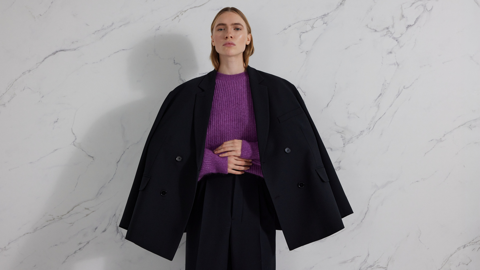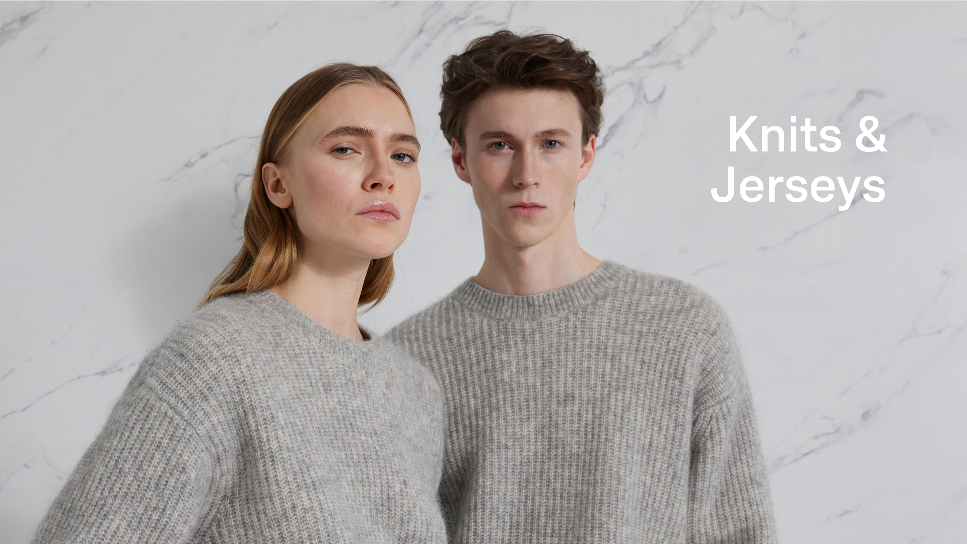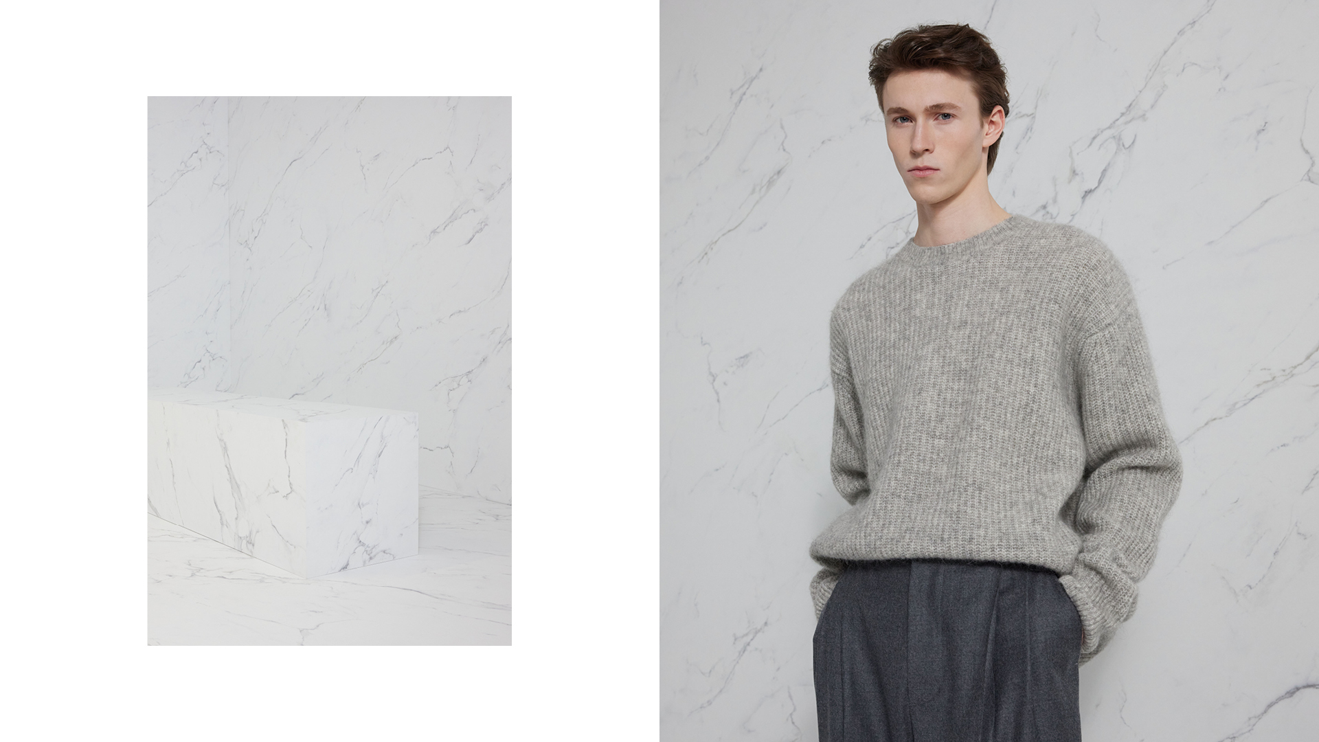 Softes Volumen aus Mohair trifft auf schmale Silhouetten in glatter Strickoptik. Tank-Tops und Rollkragen aus feingerippter Merinowolle erweitern das Sortiment um essenzielle Pieces. Dreidimensionale Rippenstrukturen spielen mit Licht und Schatten. Ergänzt wird der Look durch merzerisierte oversized T-Shirts in den Farben der Kollektion, die den bewusst unaufgeregten und dennoch pointierten Ausdruck vollenden. Graumélanges und metallische Akzente sorgen für Spannung.