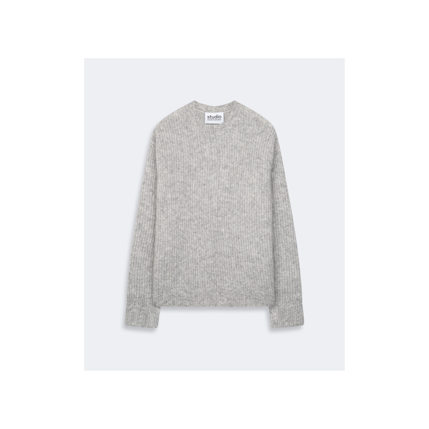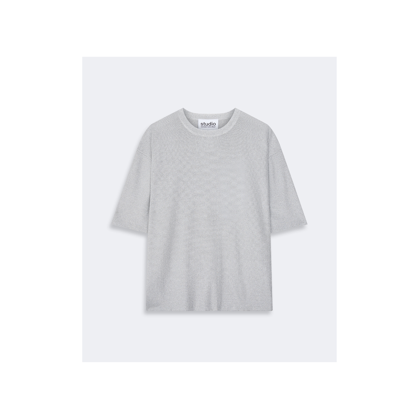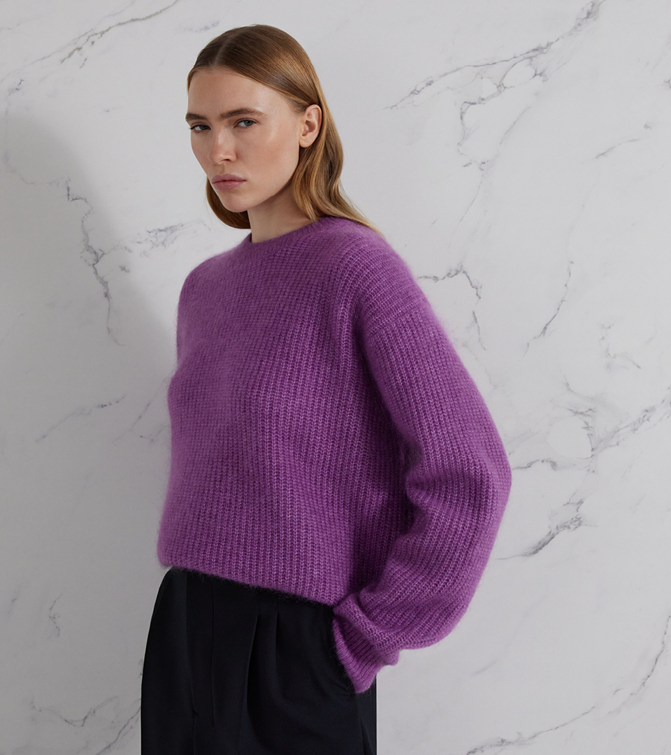 Softes Volumen aus Mohair trifft auf schmale Silhouetten in glatter Strickoptik. Tank-Tops und Rollkragen aus feingerippter Merinowolle erweitern das Sortiment um essenzielle Pieces. Dreidimensionale Rippenstrukturen spielen mit Licht und Schatten. Ergänzt wird der Look durch merzerisierte oversized T-Shirts in den Farben der Kollektion, die den bewusst unaufgeregten und dennoch pointierten Ausdruck vollenden. Graumélanges und metallische Akzente sorgen für Spannung.